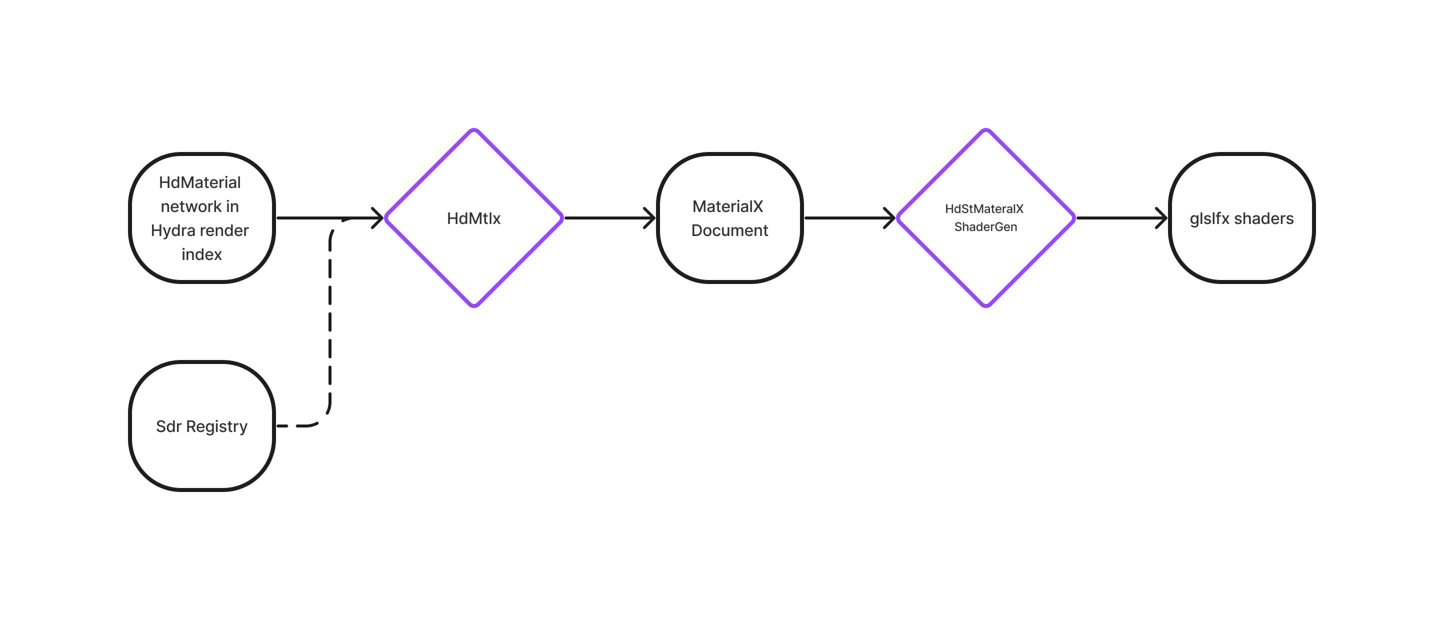For Storm to render the HdMaterial network, it needs to generate a GLSLFX shader. To generate the GLSLFX shader, Storm uses the GLSL and MSL shader generation features of MaterialX.