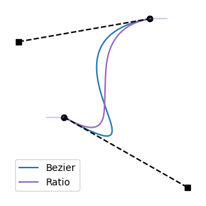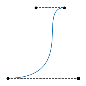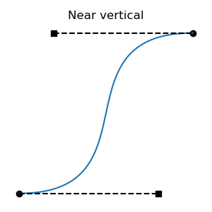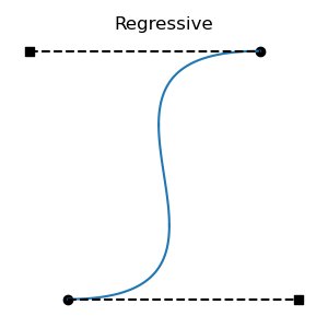 All regressive cases have at least one tangent outside the interval. Is the converse also true: that all cases with a tangent outside the interval are regressive? No: there are non-regressive curve shapes that can only be achieved by placing one of the tangent endpoints outside the interval. This can be non-regressive if the out-of-bounds tangent isn't too long, and the segment's other tangent is short enough. These cases are fairly atypical, involving regions of rapid change, but they are valid functions: