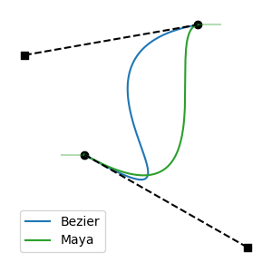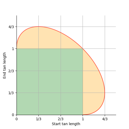 regressDemo, the way this behavior looks in the tangent-length graph is that the point collides with the center of the edge of the ellipse, then slides down it.regressDemo, the way this behavior looks in the tangent-length graph is that the point collides with the fringe of the edge of the ellipse, and stops there.With Keep Start, manipulating the length of the start tangent (but not the end tangent; recall that Keep Start is asymmetrical) behaves similarly to Limit Opposite, as described above. However, in the fringe case, the opposite tangent will in fact be lengthened until the (4/3, 1/3) maximum is reached. This is for compatibility with Maya.